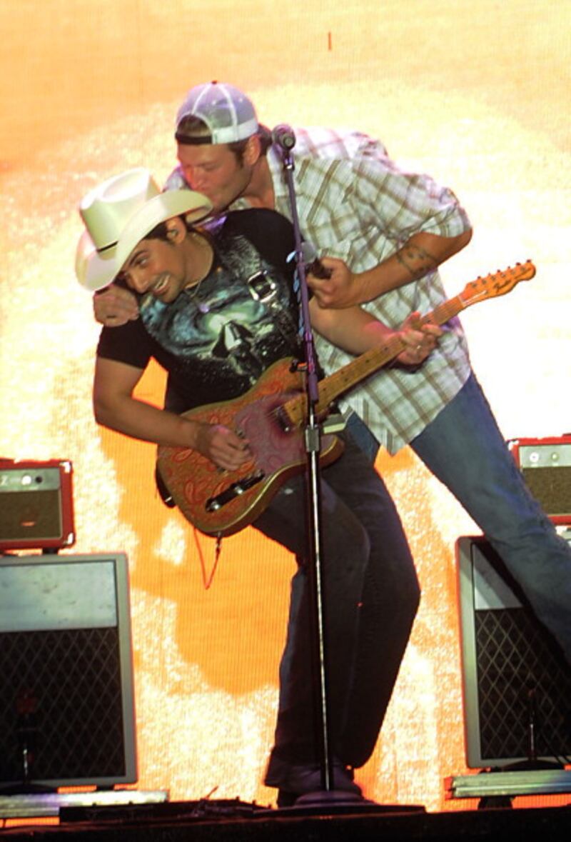 Through the years Blake Shelton joins Brad Paisley on stage and performs during The 2011 Country Stampede Day 3 at Tuttle Creek State Park on June 25, 2011 in Manhattan, Kansas. (Photo by Rick Diamond/Getty Images) (Rick Diamond/Getty Images)