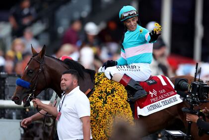 148th Preakness Stakes: Jockey John Velazquez rides National Treasure across the finish line at the Preakness Stakes. (Patrick Smith/Getty Images)
