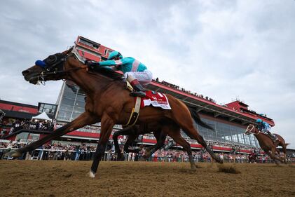 148th Preakness Stakes: Jockey John Velazquez and National Treasure cross the finish line to win the 148th Preakness Stakes. (Patrick Smith/Getty Images)