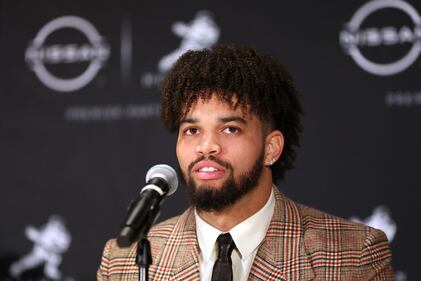 2022 Heisman Trophy Presentation NEW YORK, NEW YORK - DECEMBER 10: Quarterback Caleb Williams of the USC Trojans speaks to the media during a press conference prior to the 2022 Heisman Trophy Presentation at New York Marriott Marquis Hotel on December 10, 2022 in New York City. (Photo by Sarah Stier/Getty Images) (Sarah Stier/Getty Images)