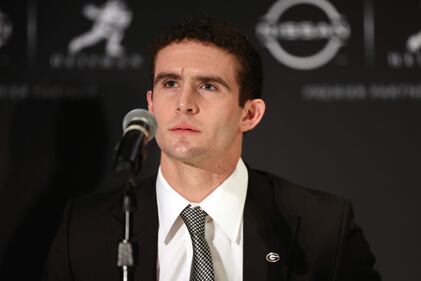 2022 Heisman Trophy Presentation NEW YORK, NEW YORK - DECEMBER 10: Quarterback Stetson Bennett of the Georgia Bulldogs speaks to the media during a press conference prior to the 2022 Heisman Trophy Presentation at New York Marriott Marquis Hotel on December 10, 2022 in New York City. (Photo by Sarah Stier/Getty Images) (Sarah Stier/Getty Images)