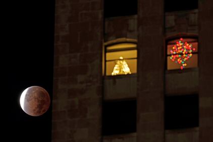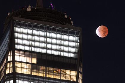 Photos: Beaver moon lunar eclipse delights skygazers The moon is seen during a lunar eclipse next to the One World Trade Center in New York early on November 19, 2021. (YUKI IWAMURA/AFP via Getty Images)