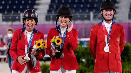 Photos: Bruce Springsteen's daughter Jessica wins Olympic silver in equestrian team jumping United States' Laura Kraut, left, Jessica Springsteen and McLain Ward, right, celebrate winning the silver medal in the equestrian jumping team final at Equestrian Park in Tokyo at the 2020 Summer Olympics, Saturday, Aug. 7, 2021, in Tokyo, Japan. (AP Photo/Carolyn Kaster)