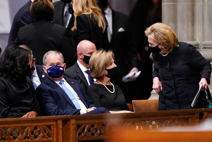 Gen. Colin Powell Funeral Former Secretary of State Hillary Clinton, right, greets former first lady Laura Bush as former first lady Michelle Obama and former President George W. Bush watch before the funeral for former Secretary of State Colin Powell at the Washington National Cathedral, in Washington, Friday, Nov. 5, 2021. (AP Photo/Andrew Harnik) (Andrew Harnik/AP)