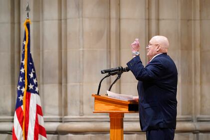 Gen. Colin Powell funeral Michael Powell gives a eulogy for his father, during the funeral for former Secretary of State Colin Powell at the Washington National Cathedral, in Washington, Friday, Nov. 5, 2021. (AP Photo/Andrew Harnik) (Andrew Harnik/AP)
