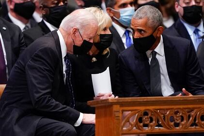 Gen. Colin Powell funeral President Joe Biden and first lady Jill Biden talk with former President Barack Obama before the funeral for former Secretary of State Colin Powell at the Washington National Cathedral, in Washington, Friday, Nov. 5, 2021. (AP Photo/Andrew Harnik) (Andrew Harnik/AP)