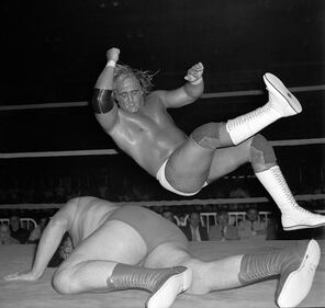 Through the years MONTREAL, CA, 1980: International Wrestling Title event featuring Hulk Hogan and Andre the Giant. Pictured here is Hulk Hogan in mid air about to deliver a “elbow smash” to Andrea the Giant’s back during their match in Montreal, Canada on 25 Aug 1980. (Photo by The Stanley Weston Archive / Getty Images) (The Stanley Weston Archive/Getty Images)