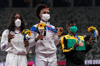 Photos: Kendra 'Keni' Harrison wins silver in 100-meter hurdles at Tokyo Olympics Jasmine Camacho-Quinn, of Puerto Rico, poses with her gold medal after winning the women's 100-meters hurdles final at the 2020 Summer Olympics, Monday, Aug. 2, 2021, in Tokyo. (AP Photo/Francisco Seco)