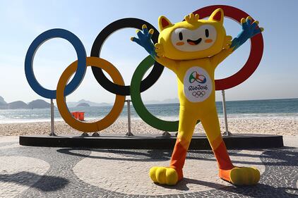 Rio 2016 RIO DE JANEIRO, BRAZIL - AUGUST 06: Rio de Janeiro Olympic mascot Vinicius poses in front of the Olympic Rings before the Men's Road Race on Day 1 of the Rio 2016 Olympic Games at the Fort Copacabana on August 6, 2016 in Rio de Janeiro, Brazil. (Photo by Alexander Hassenstein/Getty Images) (Alexander Hassenstein/Getty Images)