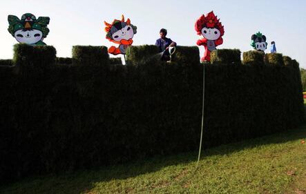 Beijing 2008 WUHAN, CHINA - APRIL 25: (CHINA OUT) A worker waters plants making up part of an Olympic-themed floral exhibition on April 25, 2008 in Wuhan of Hubei Province, China. Nearly 2 million pots of flowers are displayed at the exhibition. China has geared up its preparations for the 2008 Beijing Olympic Games, 105 days ahead of the its opening ceremony. (Photo by China Photos/Getty Images) (China Photos/Getty Images)