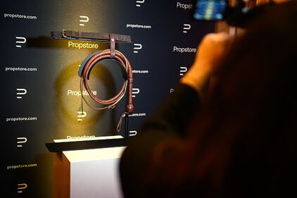 Propstore auction LONDON, ENGLAND - AUGUST 06: The belt and bullwhip (estimated sale price of $250,000-500,000) used by the character Indiana Jones in "Indiana Jones and Last Crusade" is displayed at a photocall ahead of an auction of entertainment memorabilia by Propstore, on August 06, 2025 in London, England. The bullwhip is among several iconic film memorabilia that will be going to auction in Los Angeles in September, alongside the screen-matched lightsaber prop, used by the character "Darth Vader" in the Star Wars films "The Empire Strikes Back and "Return Of The Jedi",' and Sauron's Helmet from, 'The Lord of the Rings.' (Photo by Leon Neal/Getty Images) (Leon Neal/Getty Images)