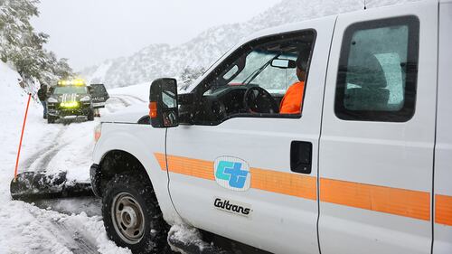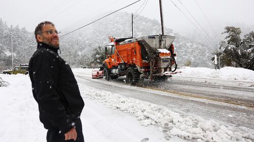 Rare winter storm brings snow to Los Angeles area A Caltrans snowplow operates in Los Angeles County, in the San Gabriel Mountains in Angeles National Forest, on Feb. 24, 2023 near La Canada Flintridge, California. A major storm, carrying a rare blizzard warning for parts of Southern California, is delivering heavy snowfall to the mountains with some snowfall expected to reach lower elevations in Los Angeles County. (Mario Tama/Getty Images)