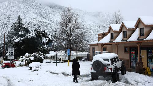 Rare winter storm brings snow to Los Angeles area A person walks in the snow outside Green Valley Market in Los Angeles County, in the Sierra Pelona Mountains, on Feb. 25, 2023 in Green Valley, California. A major storm, carrying a rare blizzard warning for parts of Southern California, is delivering heavy snowfall to the mountains with some snowfall expected to reach lower elevations in Los Angeles County. The National Weather Service has called the storm "one of the strongest ever" to impact southwest California as it has also delivered widespread heavy rains and high winds. (Mario Tama/Getty Images)