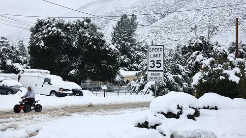 Rare winter storm brings snow to Los Angeles area A person drives an ATV through the snow in Los Angeles County, in the Sierra Pelona Mountains, on Feb. 25, 2023 in Green Valley, California. A major storm, carrying a rare blizzard warning for parts of Southern California, is delivering heavy snowfall to the mountains with some snowfall expected to reach lower elevations in Los Angeles County. The National Weather Service has called the storm "one of the strongest ever" to impact southwest California as it has also delivered widespread heavy rains and high winds. (Mario Tama/Getty Images)