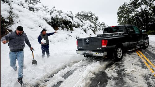 Rare winter storm brings snow to Los Angeles area People assist the driver of a truck which became stuck in the snow on a roadway in in Los Angeles County, in the Sierra Pelona Mountains, on Feb. 25, 2023 in Green Valley, California. A major storm, carrying a rare blizzard warning for parts of Southern California, is delivering heavy snowfall to the mountains with some snowfall expected to reach lower elevations in Los Angeles County. (Mario Tama/Getty Images)
