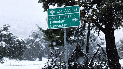 Rare winter storm brings snow to Los Angeles area A sign points to Los Angeles as snow falls in Los Angeles County, in the Sierra Pelona Mountains, on Feb. 25, 2023 in Green Valley, California. A major storm, carrying a rare blizzard warning for parts of Southern California, is delivering heavy snowfall to the mountains with some snowfall expected to reach lower elevations in Los Angeles County. The National Weather Service has called the storm "one of the strongest ever" to impact southwest California as it has also delivered widespread heavy rains and high winds. (Mario Tama/Getty Images)