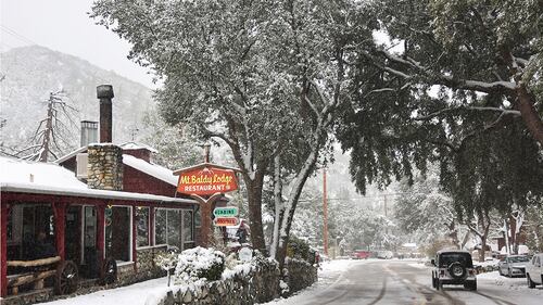 Rare winter storm brings snow to Los Angeles area Snow falls above a restaurant in the San Gabriel Mountains, in San Bernardino County along the eastern border of Los Angeles County, on Feb. 23, 2023 in Mount Baldy, California. A major storm, carrying a rare blizzard warning for parts of Southern California, is expected to deliver heavy snowfall to the mountains with some snowfall expected to reach lower elevations in L.A. County. (Mario Tama/Getty Images)