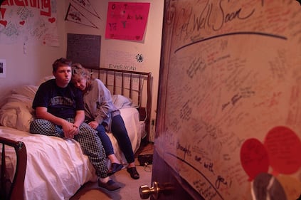 Columbine anniversary Columbine High School student Mark Taylor, a victim of student gunmen Eric Harris & Dylan Klebold in their April massacre at school, with mom Donna in his bedroom decorated with well wishes sent from students around country. (Steve Liss/The LIFE Images Collection via G)