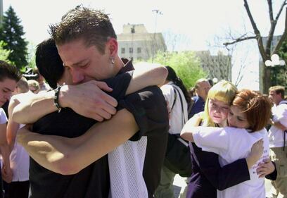 Columbine anniversary Friends of the victims of the April 20, 1999, Columbine High School shooting embrace after the moment of silence observed statewide during a ceremony held at the state capital in Denver, Colorado 20 April 2000. Twelve students and one teacher were killed by two student gunmen who then committed suicide. (MARK LEFFINGWELL/AFP via Getty Images)