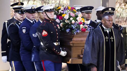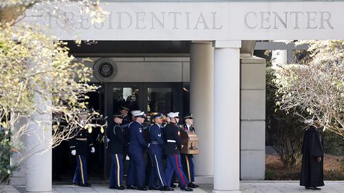 Rosalynn Carter remembered at tribute service A military honor guard carries the casket of late US First Lady Rosalynn Carter from the Jimmy Carter Presidential Library and Museum in Atlanta, Georgia, on November 28, 2023, en route for an afternoon tribute service at Glenn Memorial Church at Emory University. (ERIK S. LESSER/POOL/AFP via Getty Images)