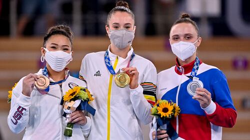 Photos: Sunisa Lee wins bronze in uneven bars final at Tokyo Olympics Bronze medalist American Sunisa Lee, gold medalist Belgian Nina Derwael and silver medalist Iliankova Anastasiia celebrate on the podium of the individual uneven bars final event in the artistic gymnastics competition, on the 10th day of the Tokyo 2020 Olympic Games in Tokyo, Japan, on August 2, 2021. (DIRK WAEM/BELGA MAG/AFP via Getty Images)