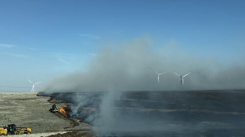 Texas scorched by massive wildfires Smoke rises as heavy equipment works to contain the Juliet Pass fire in Armstrong County, Texas, United States on February 27, 2024. (Photo by Texas A&M Forest Service/Anadolu via Getty Images) (Anadolu/Anadolu via Getty Images)