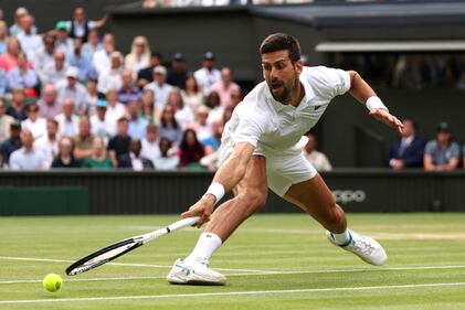 Wimbledon men’s championship 2023 LONDON, ENGLAND - JULY 16: Novak Djokovic of Serbia stretches to make a shot during the Men's Singles Final against Carlos Alcaraz of Spain on day fourteen of The Championships Wimbledon 2023 at All England Lawn Tennis and Croquet Club on July 16, 2023 in London, England. (Photo by Julian Finney/Getty Images) (Julian Finney/Getty Images)