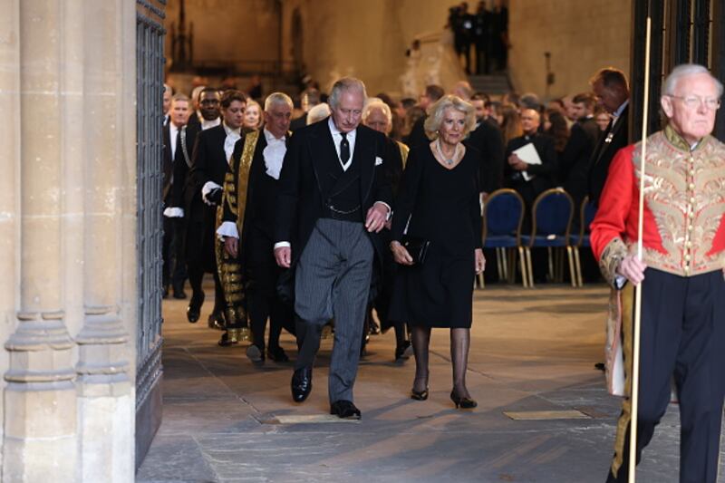 Photos: King Charles III addresses Parliament, vows to follow Queen Elizabeth II's example Britain's King Charles III and Camilla, Queen Consort walk in the hall as they take part in the presentation of Addresses by both Houses of Parliament as Camilla, Queen Consort, looks on in Westminster Hall, inside the Palace of Westminster on September 12, 2022, in London. (Henry Nicholls-WPA Pool/Getty Images)