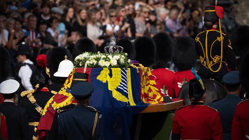 Update 2 p.m. EDT Sept. 14: The queen’s coffin was draped with the Royal Standard, the Imperial State Crown and a wreath of flowers including white roses, white dahlias and a selection of foliage as it was transported Wednesday from Buckingham Palace to Westminster Hall, according to Buckingham Palace officials.