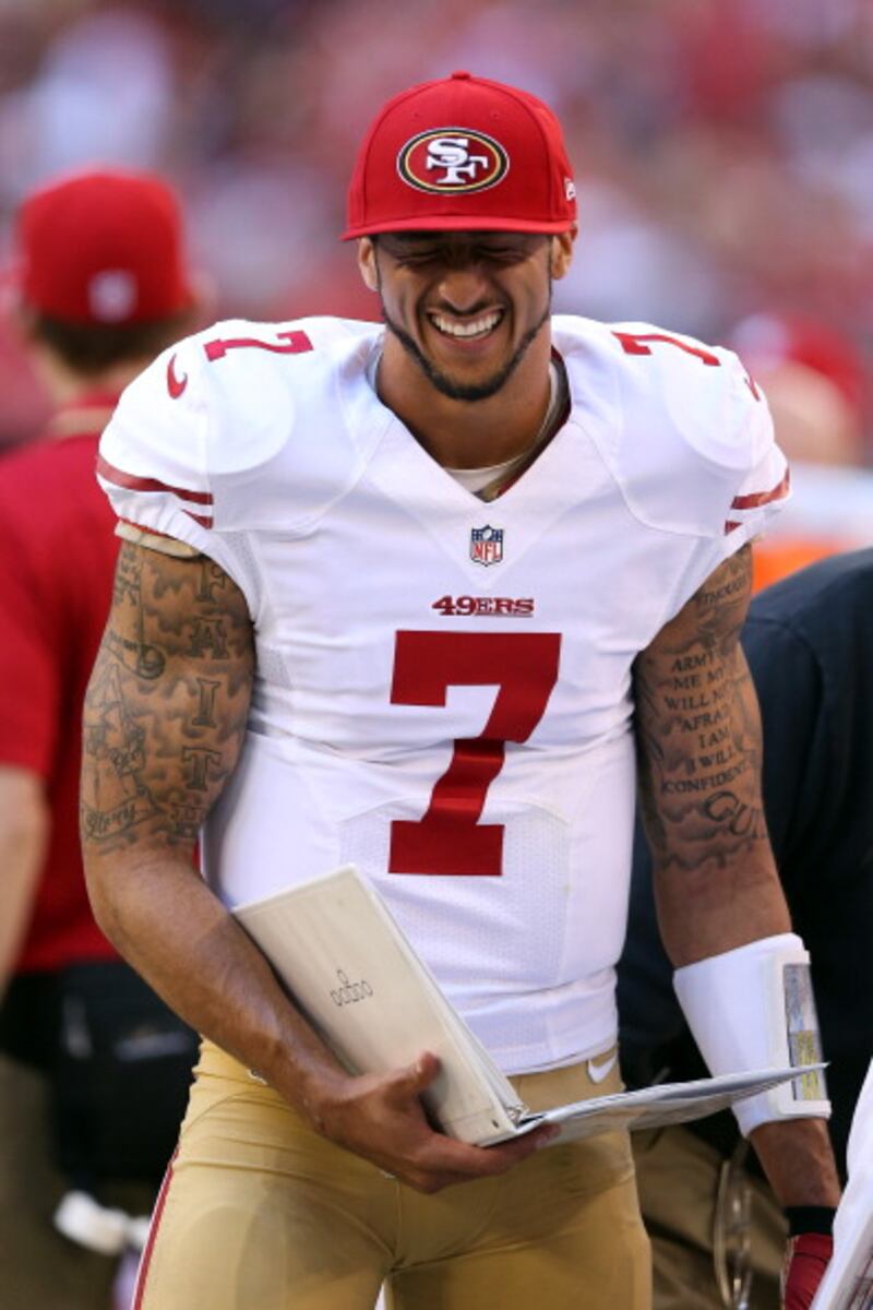 Colin Kaepernick #7 of the San Francisco 49ers smiles on the sideline against the Arizona Cardinals during a game at University of Phoenix Stadium on December 29, 2013 in Glendale, Arizona. (Photo by Christian Petersen/Getty Images)