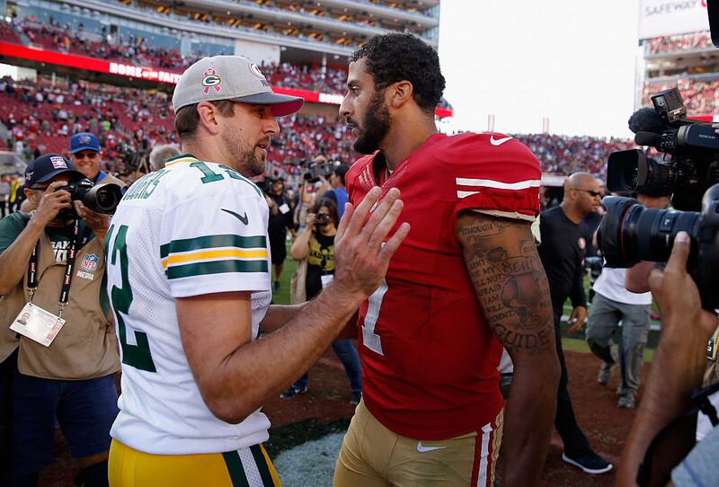 Colin Kaepernick #7 of the San Francisco 49ers talks with Aaron Rodgers #12 of the Green Bay Packers after their game at Levi's Stadium on October 4, 2015 in Santa Clara, California. (Photo by Ezra Shaw/Getty Images)