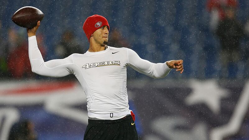 Colin Kaepernick #7 of the San Francisco 49ers warms up before a game with the New England Patriots at Gillette Stadium on December 16, 2012 in Foxboro, Massachusetts. (Photo by Jim Rogash/Getty Images)