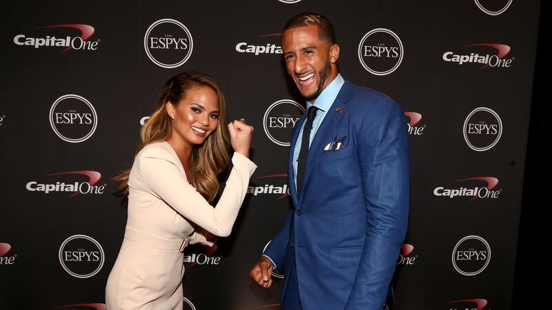 (L-R) Model Chrissy Teigen and NFL quarterback Colin Kaepernick backstage at The 2014 ESPYS at Nokia Theatre L.A. Live on July 16, 2014 in Los Angeles, California. (Photo by Christopher Polk/Getty Images For ESPYS)