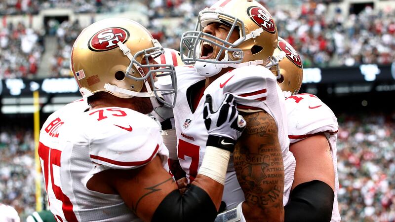 Colin Kaepernick #7 celebrates a touchdown with Alex Boone #75 and Joe Staley #74 of the S.F. 49ers during a game against the New York Jets at MetLife Stadium on September 30, 2012 in East Rutherford, New Jersey. (Photo: Jeff Zelevansky/Getty Images)