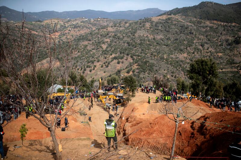 Boy trapped in Moroccan well dies Residents watch civil defense workers and local authorities attempting to rescue a 5 year old boy who fell into a hole near the town of Bab Berred near Chefchaouen, Friday, Feb. 4, 2022 in Ighran. A third day of efforts to rescue a 5-year-old boy who fell into a well in northern Morocco was halted for a time on Friday following concerns about ground stability, fueling despair among those hoping to reach him. The boy, identified as Rayan, fell into a 32-meter (105-feet) deep well located outside his home in the northern village of Ighran in Morocco's Chefchaouen province on Tuesday evening.(AP Photo/Mosa'ab Elshamy) (Mosa'ab Elshamy/AP)