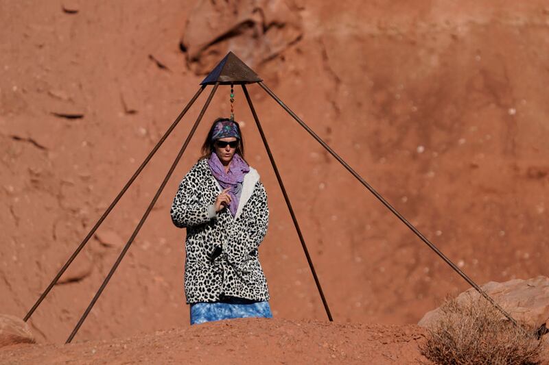 Ring of Fire: A woman meditates as she watches the annular solar eclipse under a pyramid structure in Capitol Reef National Park, Utah. (George Frey/Getty Images)