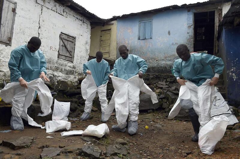 2014 2014 - Medical staff members of the Croix Rouge NGO put on protective suits before collecting the corpse of a victim of Ebola in Monrovia on Sept. 29, 2014.