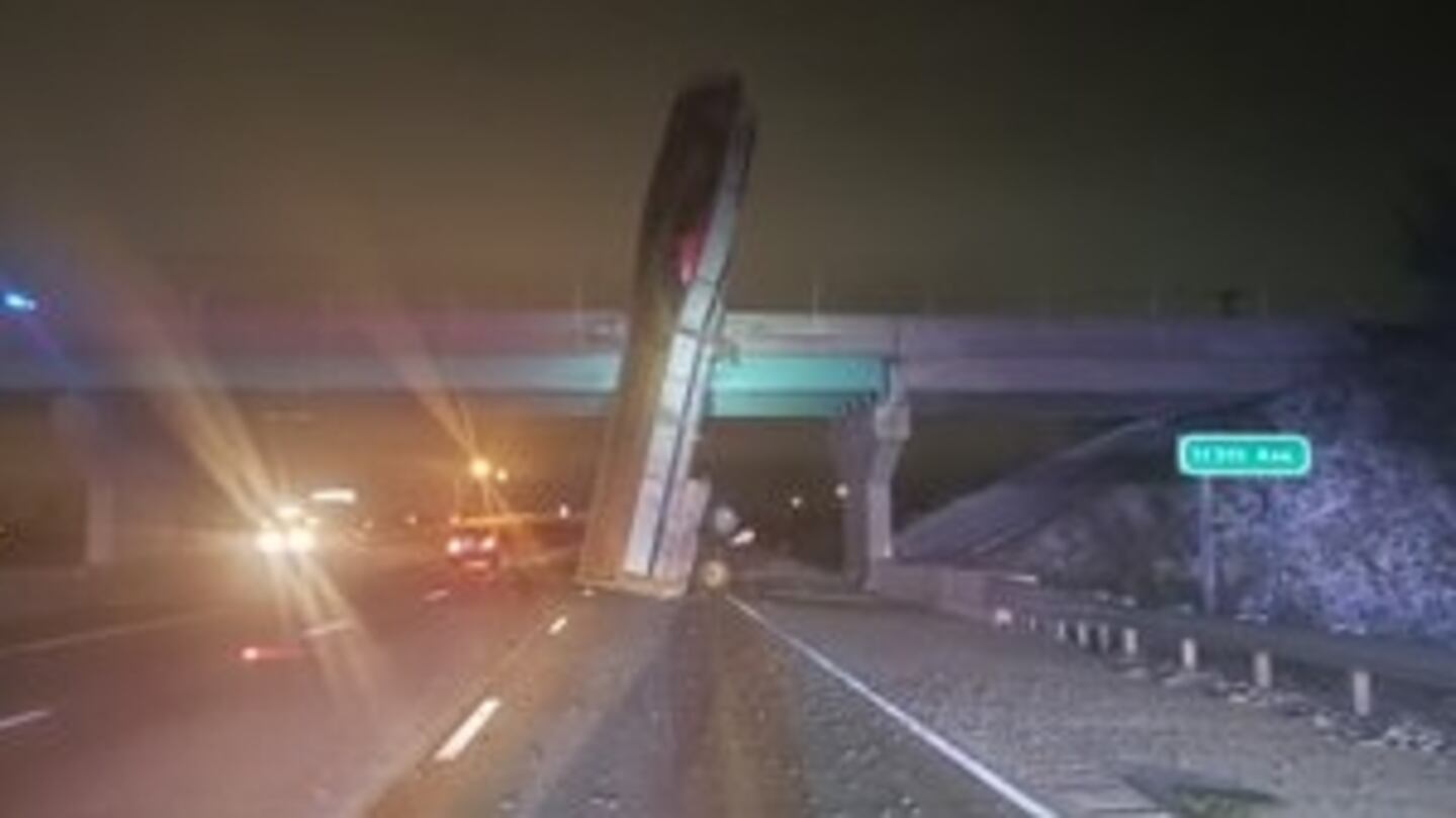 CROWN POINT, Ind. — It’s unclear how it happened, but an empty dump trailer crashed, leaving the vehicle upended against an Indiana highway overpass Thursday morning.