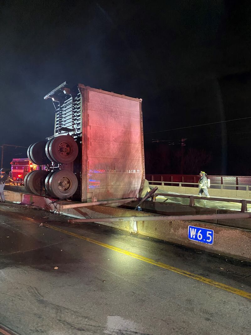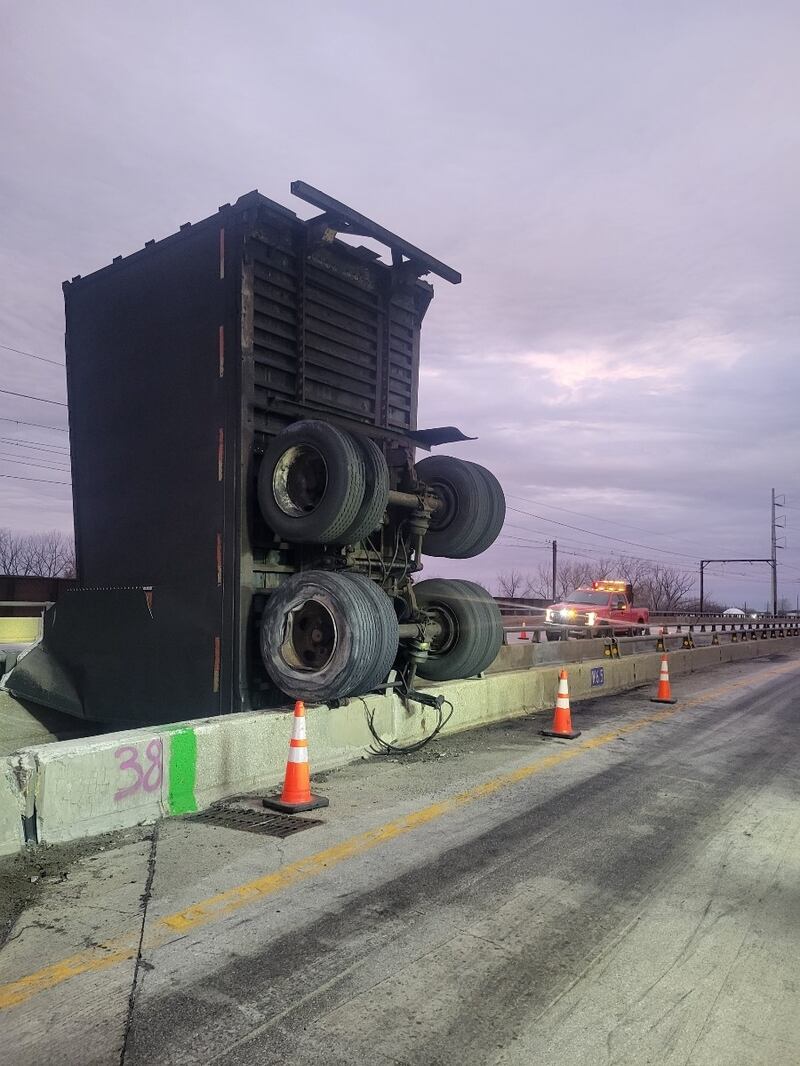 State police described the truck as remaining “perpendicular, hanging off the bridge in between the east and westbound lanes.” The crash also caused the truck to burst into flames.
