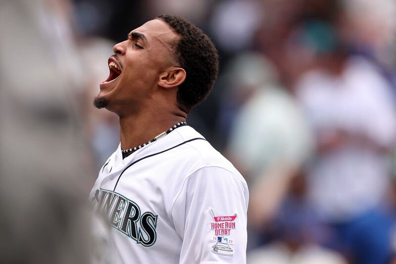 2023 Home Run Derby: Julio Rodríguez of the Seattle Mariners reacts after hitting 41 homers during his first appearance in Monday's Home Run Derby at T-Mobile Park. (Steph Chambers/Getty Images)