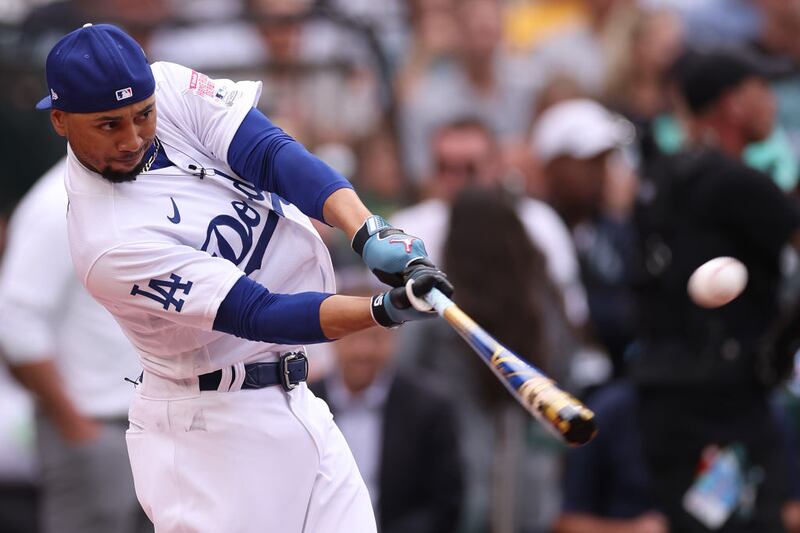 2023 Home Run Derby: Mookie Betts of the Los Angeles Dodgers belts one during Monday's Home Run Derby. (Steph Chambers/Getty Images)