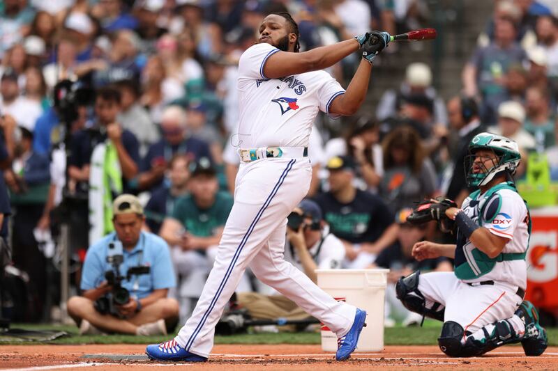 2023 Home Run Derby: Vladimir Guerrero Jr. of the Toronto Blue Jays connects during the Home Run Derby in Seattle. (Tim Nwachukwu/Getty Images)
