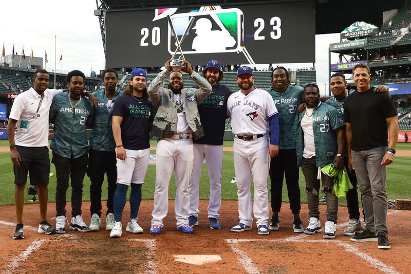 2023 Home Run Derby: Vladimir Guerrero Jr. is styling after winning Monday's Home Run Derby at Seattle's T-Mobile Park. (Steph Chambers/Getty Images)
