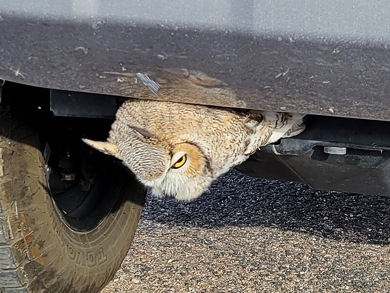 Colorado Parks and Wildlife shared photos of the animal on social media, and said rescuers were called to a report of an owl stuck in a truck grille. Rescuers found the great horned owl both stuck and alive.