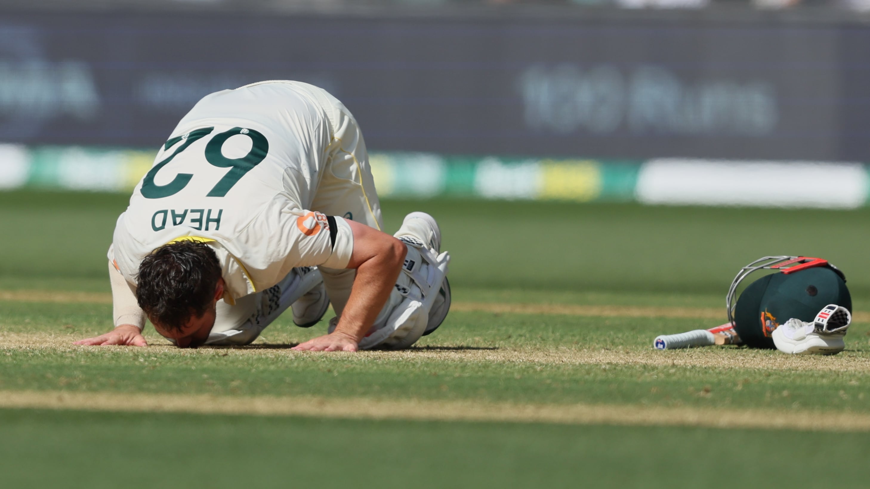 Australia England Cricket Australia's Travis Head kisses the pitch after scoring a century during play on day three of the third Ashes cricket test between England and Australia in Adelaide, Australia, Friday, Dec. 19, 2025. (AP Photo/James Elsby) (James Elsby/AP)