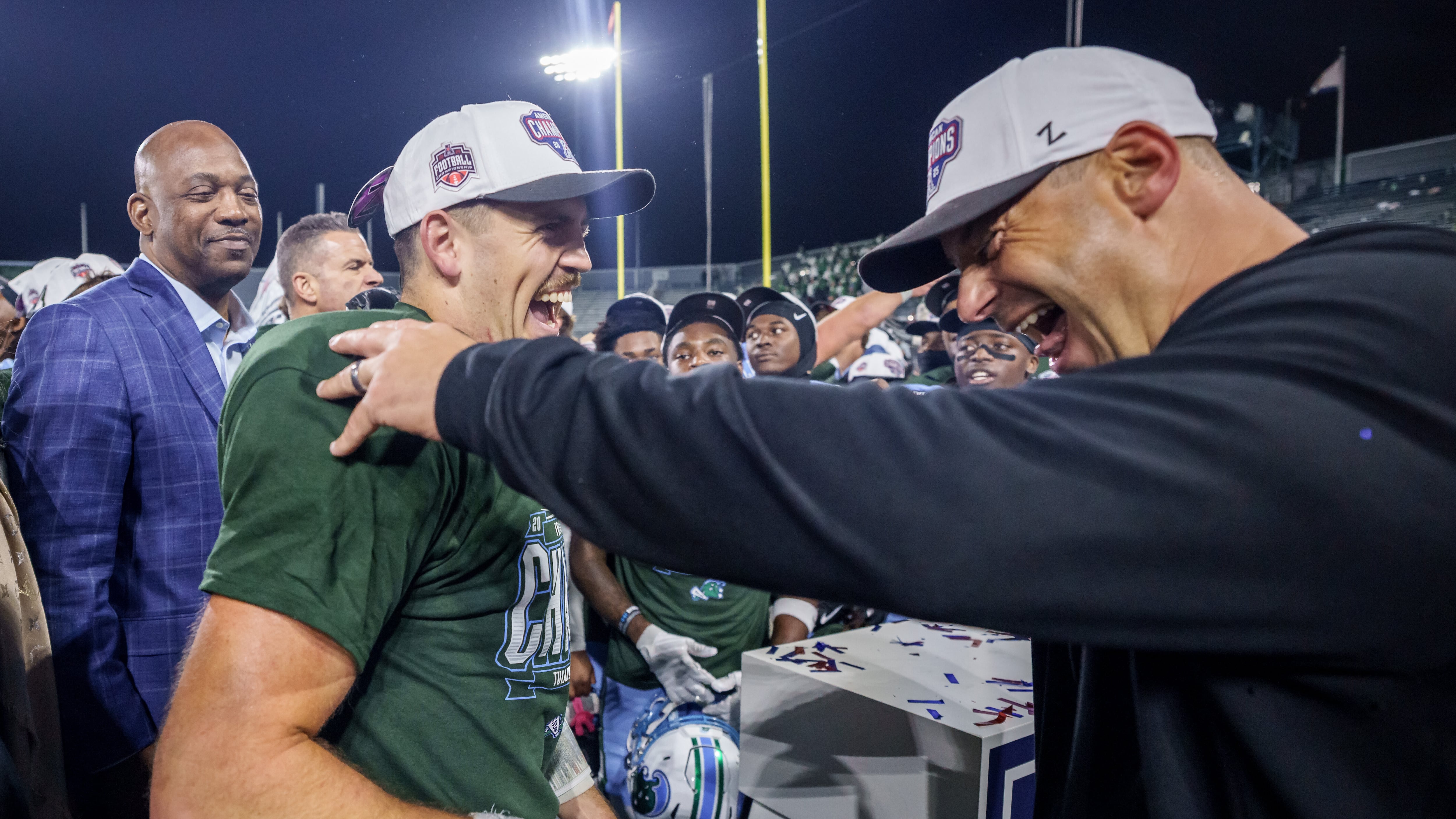 American Conference Championship Football Tulane head coach Jon Sumrall, right, reacts with Tulane quarterback Jake Retzlaff (12) after winning the American Conference championship NCAA college football game against North Texas in New Orleans, Friday, Dec. 5, 2025. (AP Photo/Matthew Hinton) (Matthew Hinton/AP)