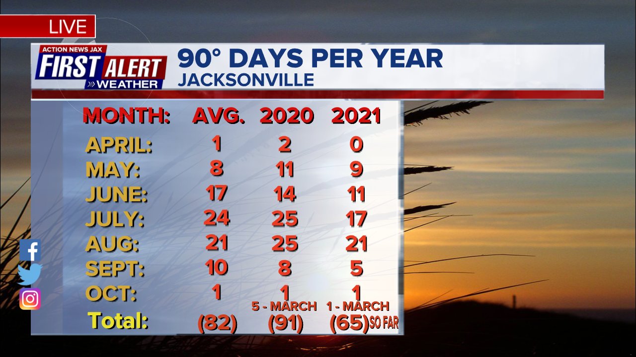 Jacksonville, FL — So here we go! - 90 degree days become more common then not over the next few months. Jacksonville averages 82 90-degree days each year but had “only” 65 such days last year vs. 91 90-degree days in 2020.