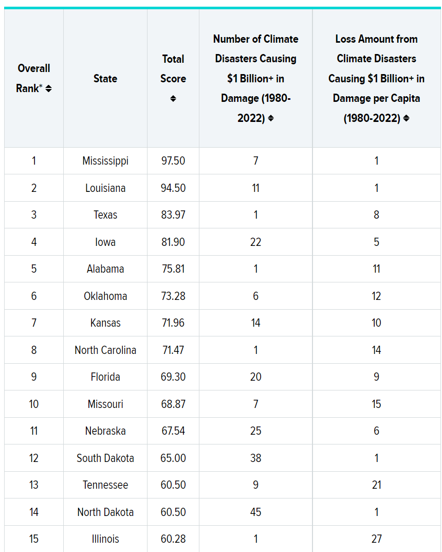 Speaking of disasters... WalletHub has a list of the states most impacted by natural disasters since 1980: