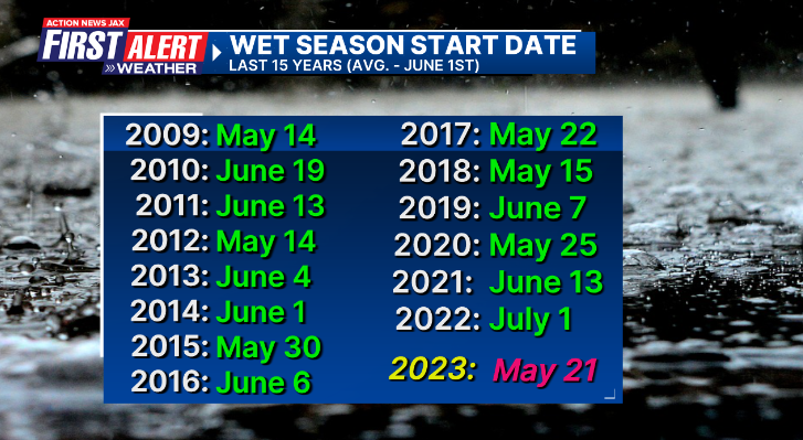Dry, dry, dry! Our “wet season” is on hold with no widespread rain anytime real soon. Jacksonville/NE Fl. & SE Ga. sees more than half their annual rainfall from June through September due to frequent showers & storms thanks to the sea breeze + some input - typically - from the tropics. The average start date for the wet season is June 1st but, of course, there’s no automatic “switch” & the starting date of the wet season can be as early as May but as late as July. Last year’s start date was May 21st (at least 3 straight days with more than half of NE Fl./SE Ga. receiving measurable rainfall *not* caused by a front or some other organized low pressure system [rain not synoptically-driven is the meteorological term]). But the rainy season waited until July 1st in 2022!