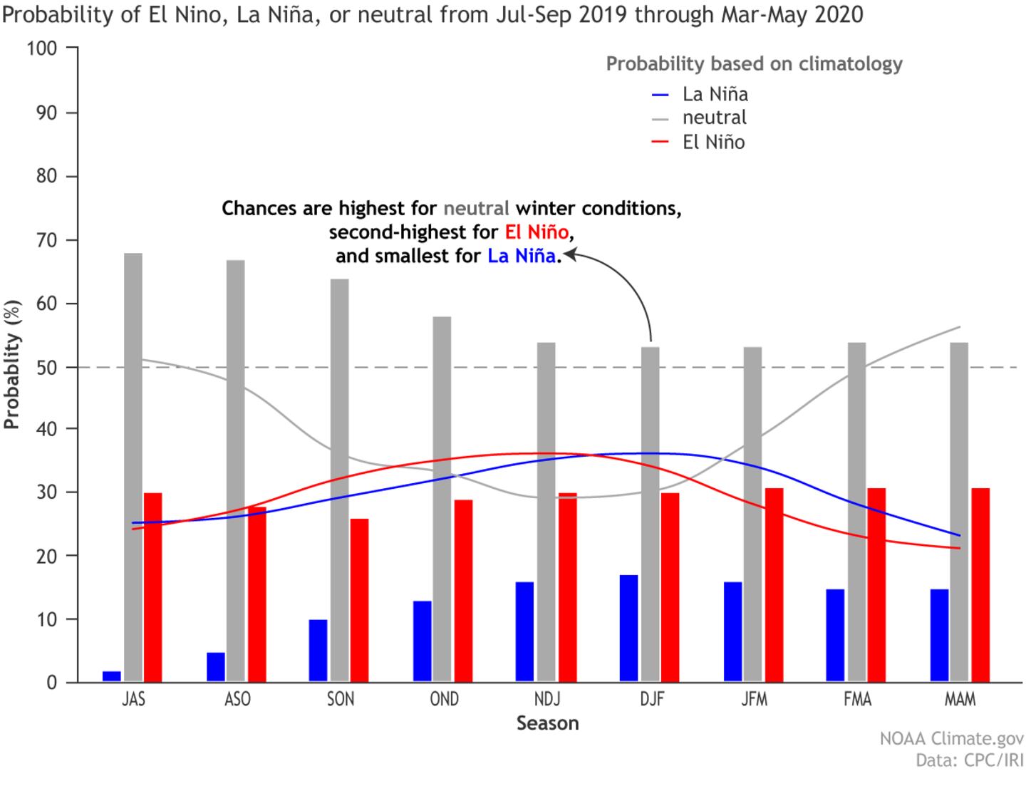Forecasts below for a neutral state vs. El Nino & vs. La Nina into spring, 2020 with a model trend of slightly positive ENSO state but still generally below the El Nino threshold: